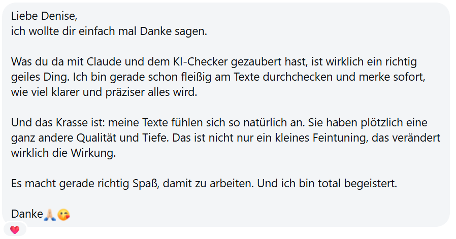 Dieser Check ist kein Standard-Skript, sondern das Ergebnis monatelanger Feinabstimmung. Du nutzt hier ein hochpräzise instruiertes Experten-Tool, das genau weiß, wo ein Text „echt“ klingt und wo die laffen Aussagen deinen Leser abspringen lassen.